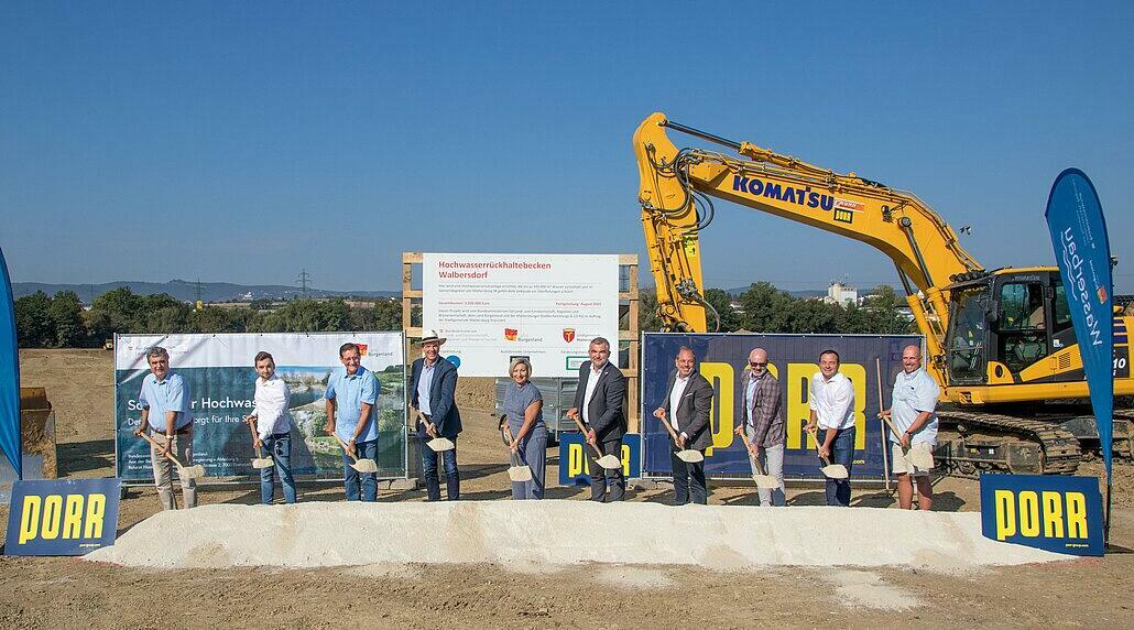 Bildtext Spatenstich Rückhaltebecken Walbersdorf: Spatenstich für das Rückhaltebecken in Walbersdorf: OBR DI Dr. Christian Maier, Amt der Bgld. LReg., Abt. 5 - Baudirektion, Leiter Referat Flussbau, DI Alex Papajanoulos MSC, Amt der Bgld. LReg., Abt. 5 - Baudirektion, Referat Flussbau, Bgm. DI Gerald Hüller, Amt der Bgld. LReg., Abteilungsvorstand Abteilung Wasser- und Abfallwirtschaft, DI Dr. Heinz Stiefelmeyer., BMI, Abt. I/6, Leitung Hochwasserrisikomanagement, Bürgermeisterin LAbg. Claudia Schlager, LR Mag. Heinrich Dorner, Baudirektor DI(FH) Wolfgang Heckenast, DI Christian Sailer, Hauptreferatsleiter Wasserwirtschaft, Prok. DI (FH) Igor Smrtnik, PORR Bau GmbH, Baumeister Jürgen Wagner, PORR GmbH (v.l.).